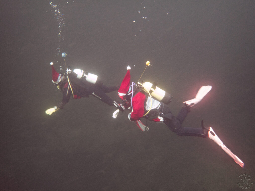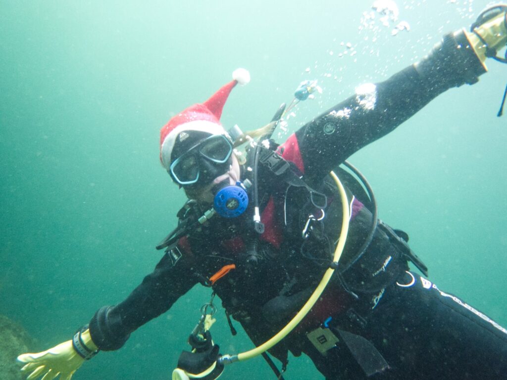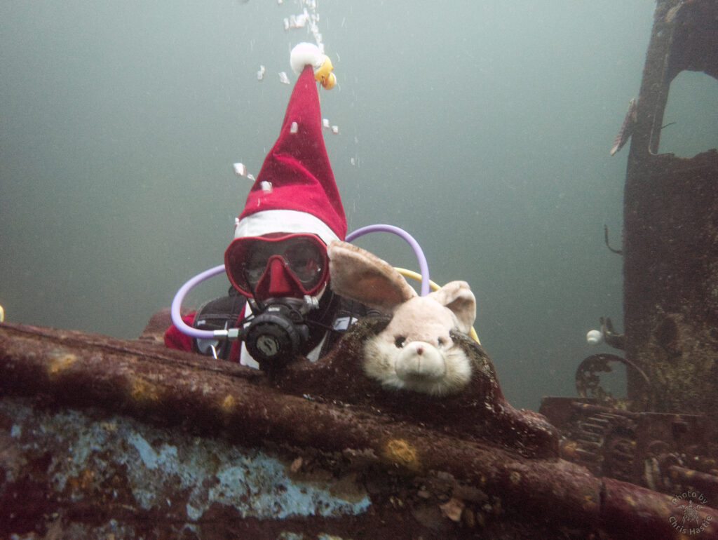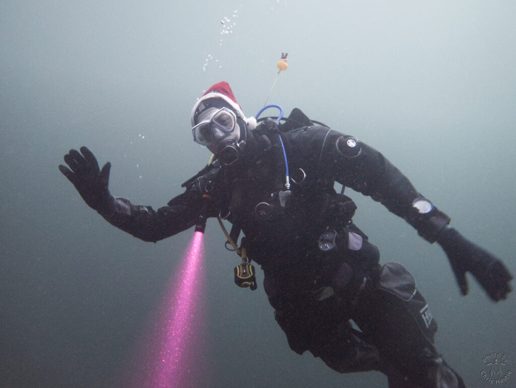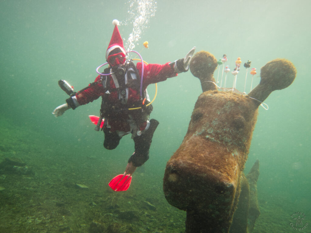 Intrepid members of Arden Divers, accompanied by a couple of friends from our neighbours at Solihull Sub Aqua Club, set out for a Santa themed Christmas dive at Stoney last Sunday. Sophie, Sarah, Luca and Chris had a great couple of dives, blessed with fantastic visibility. The famous Stoney Cove underwater Christmas tree was there to add festive cheer, and we did our bit by decorating Nessie with some seasonal headgear. And, of course, there was plenty of festive food to eat between dives. All in all a fabulous day out! So much so, we’re thinking of going back for New Years Eve 🙂