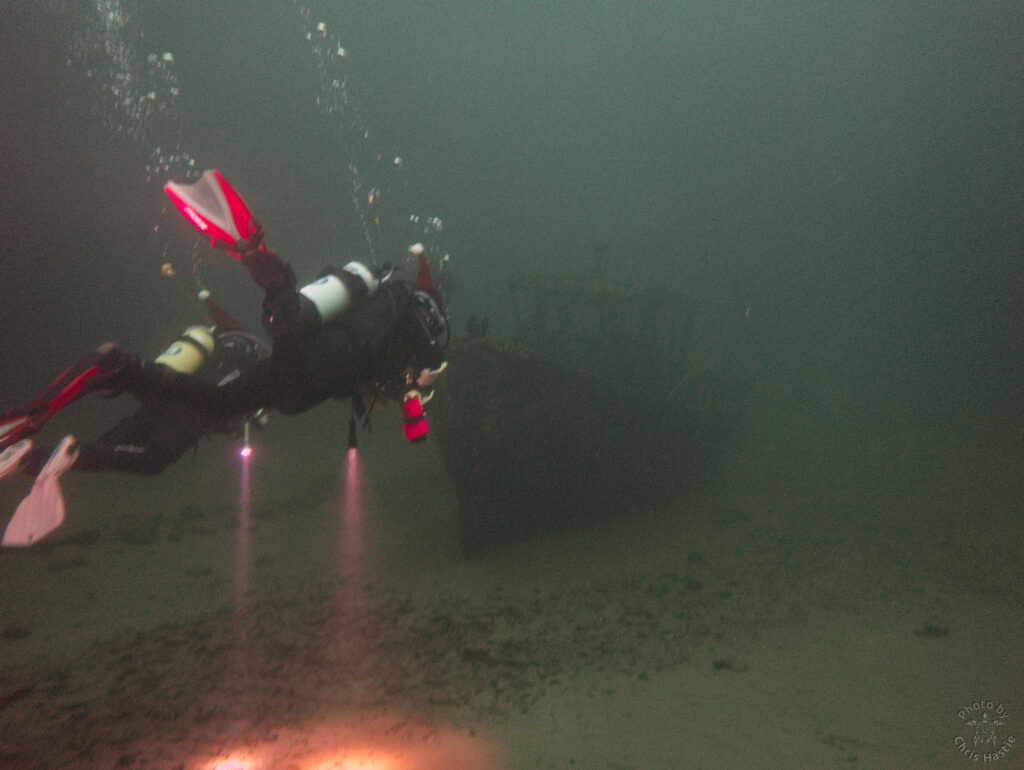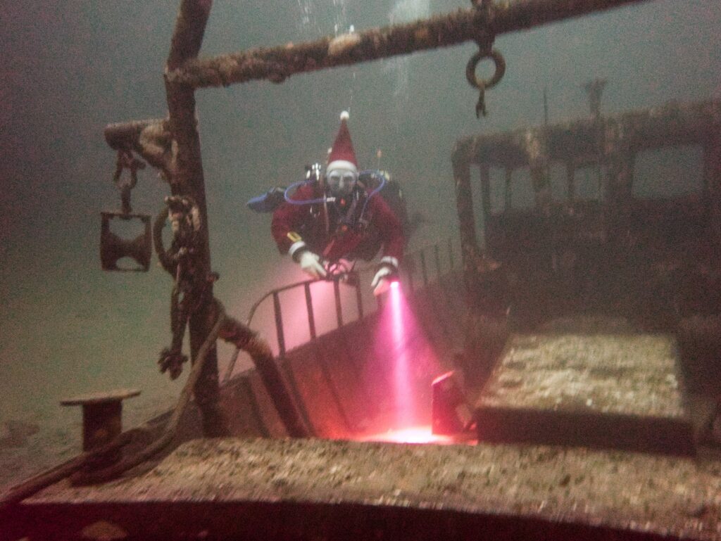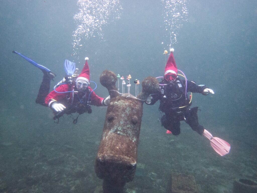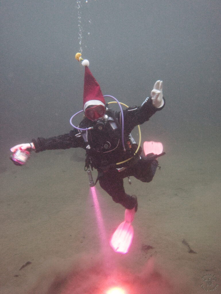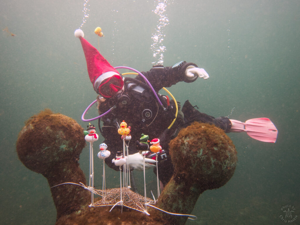 Intrepid members of Arden Divers, accompanied by a couple of friends from our neighbours at Solihull Sub Aqua Club, set out for a Santa themed Christmas dive at Stoney last Sunday. Sophie, Sarah, Luca and Chris had a great couple of dives, blessed with fantastic visibility. The famous Stoney Cove underwater Christmas tree was there to add festive cheer, and we did our bit by decorating Nessie with some seasonal headgear. And, of course, there was plenty of festive food to eat between dives. All in all a fabulous day out! So much so, we’re thinking of going back for New Years Eve 🙂