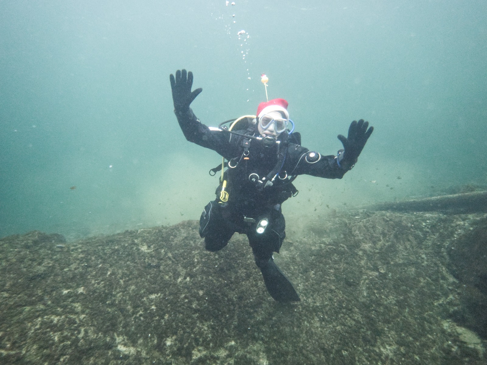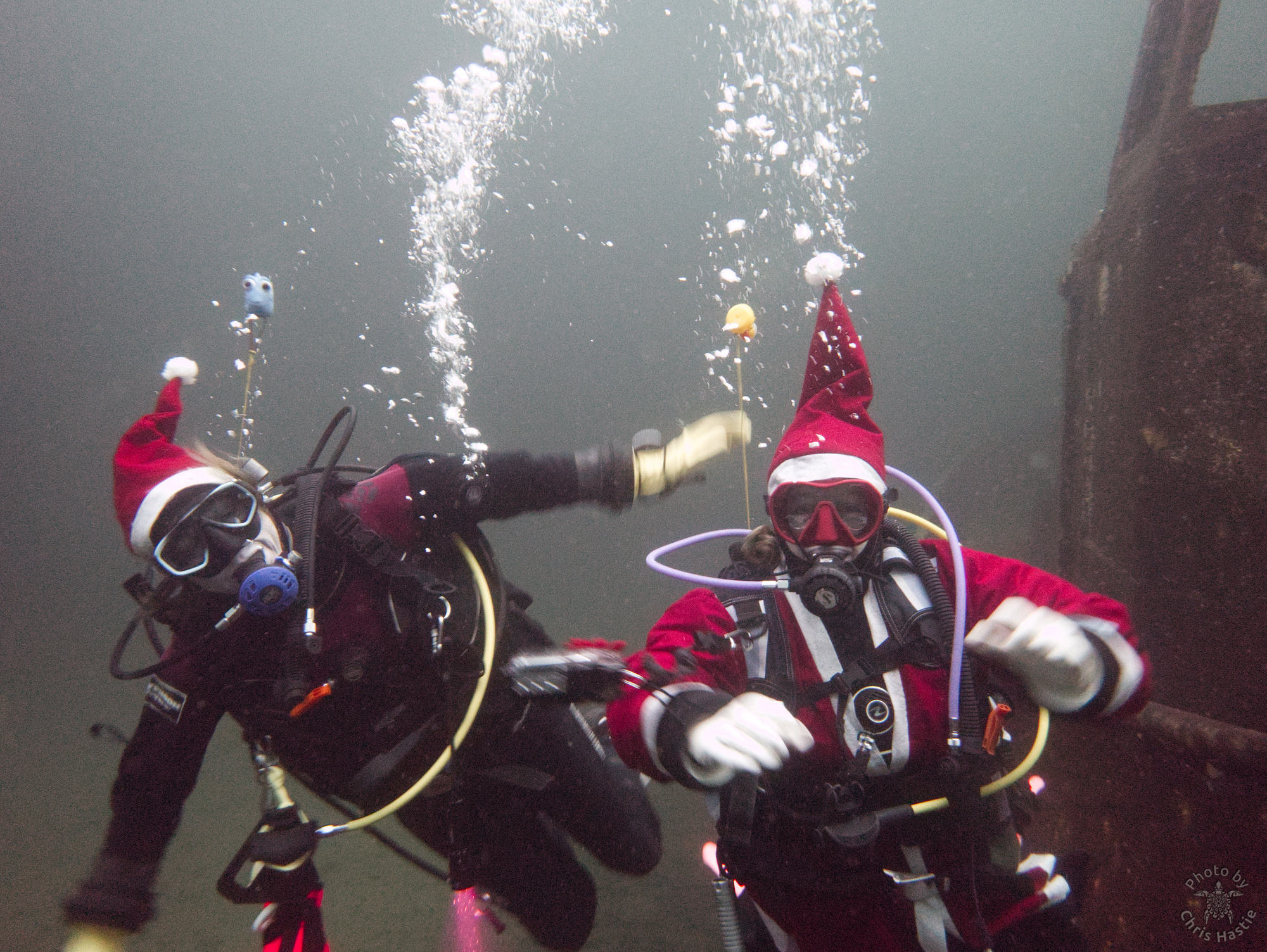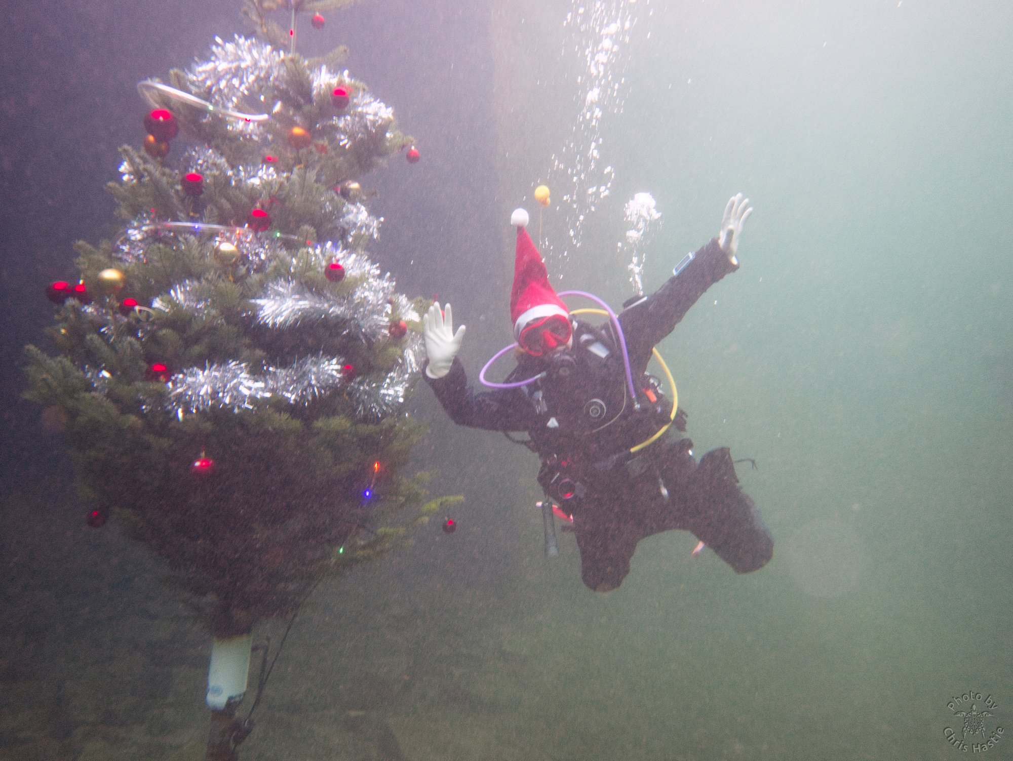 Intrepid members of Arden Divers, accompanied by a couple of friends from our neighbours at Solihull Sub Aqua Club, set out for a Santa themed Christmas dive at Stoney last Sunday. Sophie, Sarah, Luca and Chris had a great couple of dives, blessed with fantastic visibility. The famous Stoney Cove underwater Christmas tree was there to add festive cheer, and we did our bit by decorating Nessie with some seasonal headgear. And, of course, there was plenty of festive food to eat between dives. All in all a fabulous day out! So much so, we’re thinking of going back for New Years Eve 🙂