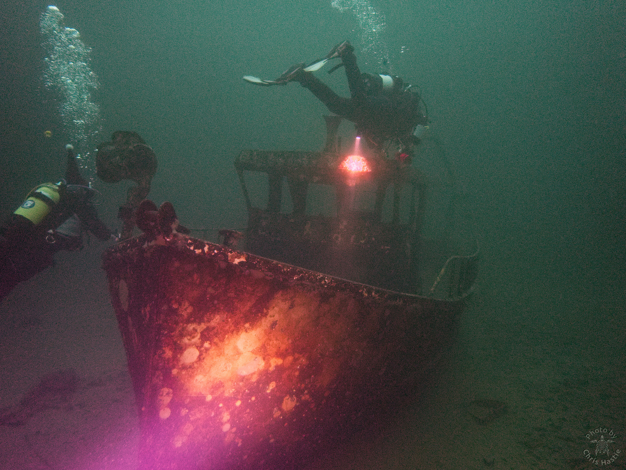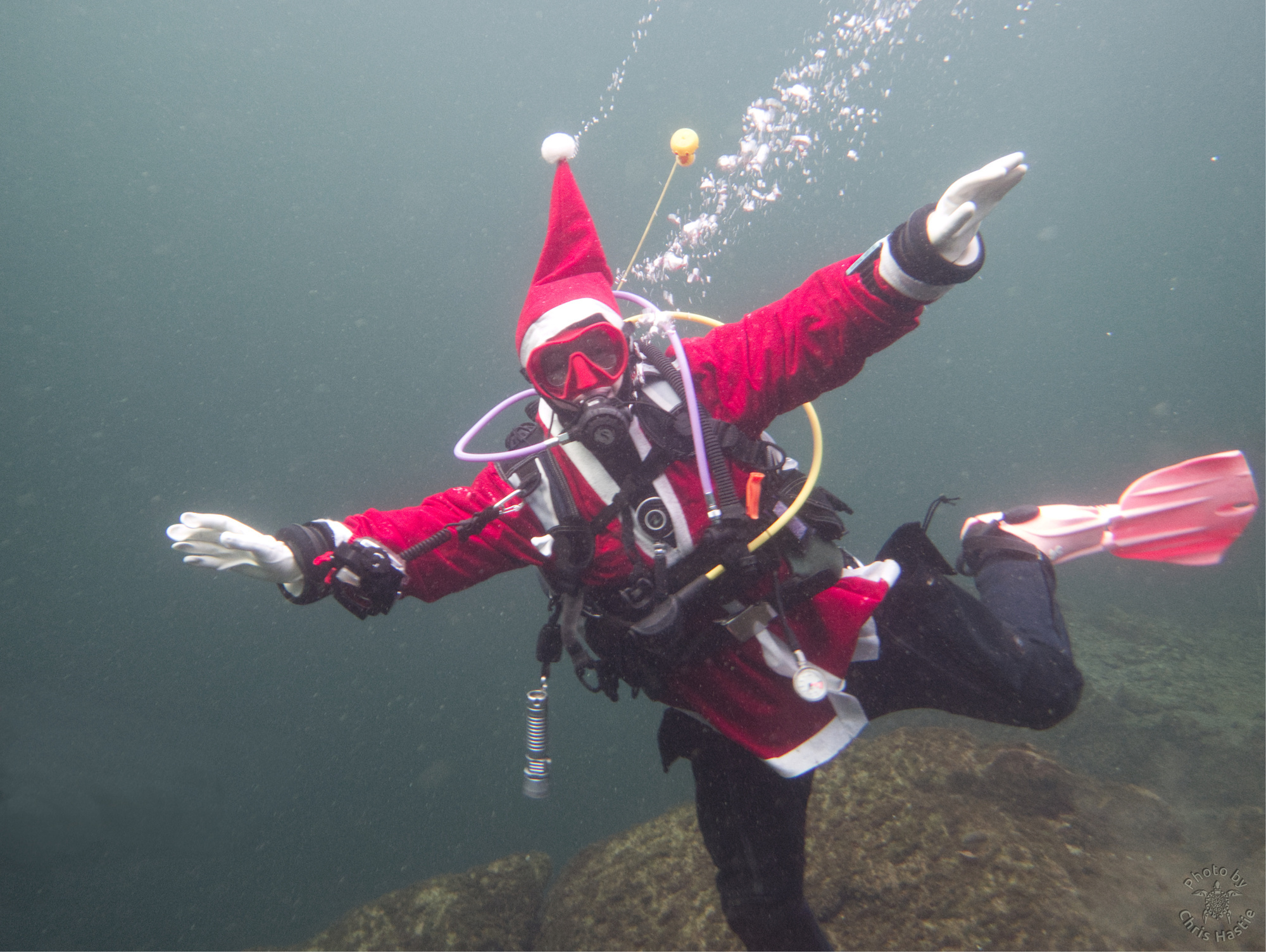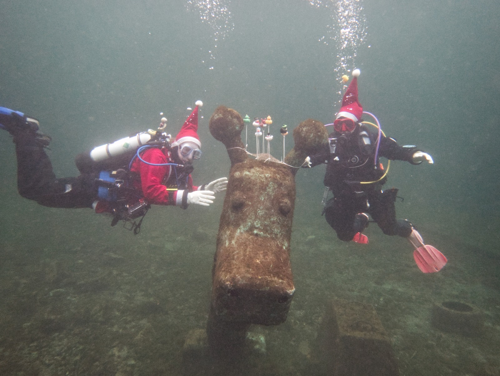 Intrepid members of Arden Divers, accompanied by a couple of friends from our neighbours at Solihull Sub Aqua Club, set out for a Santa themed Christmas dive at Stoney last Sunday. Sophie, Sarah, Luca and Chris had a great couple of dives, blessed with fantastic visibility. The famous Stoney Cove underwater Christmas tree was there to add festive cheer, and we did our bit by decorating Nessie with some seasonal headgear. And, of course, there was plenty of festive food to eat between dives. All in all a fabulous day out! So much so, we’re thinking of going back for New Years Eve 🙂